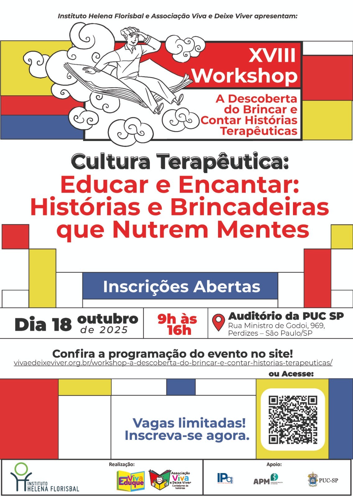 🎉 Vem aí o Workshop “A Descoberta do Brincar e Contar Histórias Terapêuticas”! 📚 Tema 2025: “Educar e Encantar: Histórias e Brincadeiras que Nutrem Mentes” 🗓️ 18 de outubro | ⏰ 9h às 16h 📍 Auditório da PUC-SP – Rua Ministro de Godoi, 969, Perdizes – SP 🚨 Inscrições abertas! Vagas limitadas! ✨ Uma