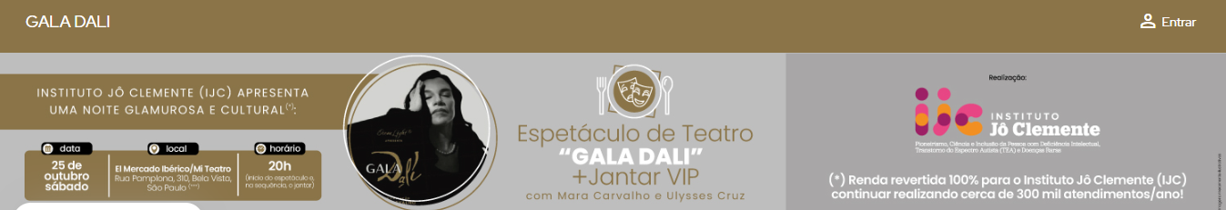 NOITE DE TEATRO, JANTAR E CULTURA, em benefício do IJC Compre agora! Ainda dá tempo de garantir o seu CONVITE para a viver uma experiência inesquecível: a peça de teatro “Gala Dalí”, estrelada por Mara Carvalho, seguida de um jantar VIP Beneficente em prol do Instituto Jô Clemente (IJC)! Aproveite agora, antes que esgote! 👉